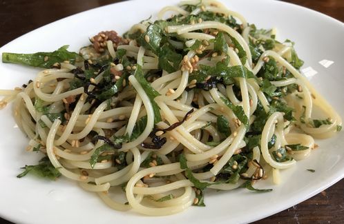 茹でて氷水で洗ったパスタをオリーブオイル・大葉・梅干・塩昆布で和えて
